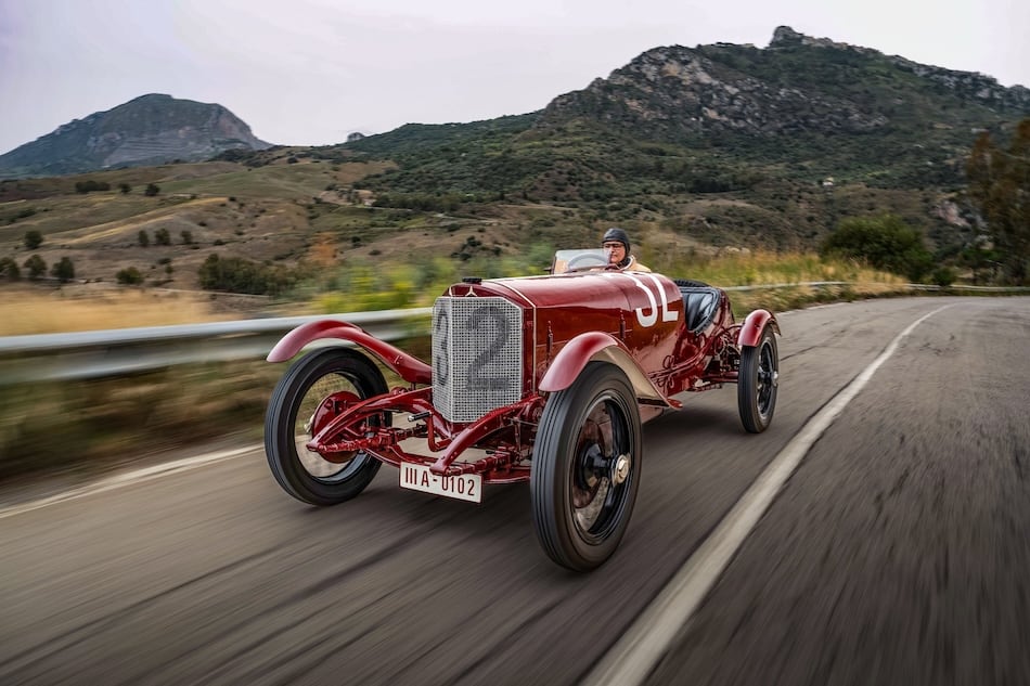 Mercedes 2-Liter-Targa-Florio-Rennwagen von 1924. Eingesetzt bei der Targa Florio Classica im Oktober 2024. Fahraufnahme von links vorn mit Mercedes-Benz Classic Markenbotschafter Karl Wendlinger am Steuer. (Fotosignatur der Mercedes-Benz Classic Archive: D845090)