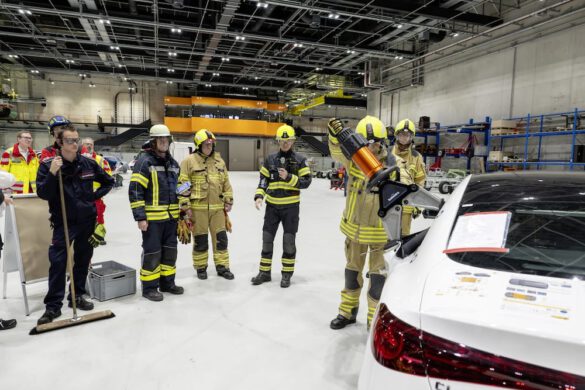 Die Pilot-Veranstaltung von „MB4Rescue“ hat kürzlich im Technologiezentrum für Fahrzeugsicherheit (Crashtesthalle) in Sindelfingen stattgefunden. Teilgenommen haben Feuerwehr-Ausbilderinnen und -Ausbilder aus Deutschland, Österreich, der Schweiz und den Niederlanden sowie Teams der Feuerwehren aus nahezu allen deutschen Werken der Mercedes‑Benz AG. Trainieren konnten die Retter an aktuellen Mercedes‑Benz Modellen wie CLA, EQE, EQS, GLE und CLE.