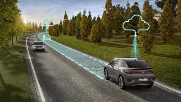 Auch bei der optionalen Navigation führt die überarbeitete Software zu Verbesserungen. Sie verortet das Fahrzeug jetzt im Rahmen der Systemgrenzen fahrstreifengenau, dadurch kann sie auf Autobahnkreuzen und -abfahrten den rechtzeitigen Wechsel des Fahrstreifens empfehlen. Der entsprechende Hinweis zur Fahrstreifenwechselempfehlung erscheint auch im ID. Light – dem Lichtband unter der Windschutzscheibe. Es wurde um neue Funktionen ergänzt und zeigt jetzt auch lokale Gefahrenwarnungen an. Dieser Dienst basiert auf der Car2X-Technologie von Volkswagen: Autos vernetzen sich über den Funkstandard WLANp direkt und lokal miteinander. Dadurch können sie sich in Echtzeit über kritische Verkehrssituationen informieren, vom Liegenbleiber bis zum Rettungswagen.