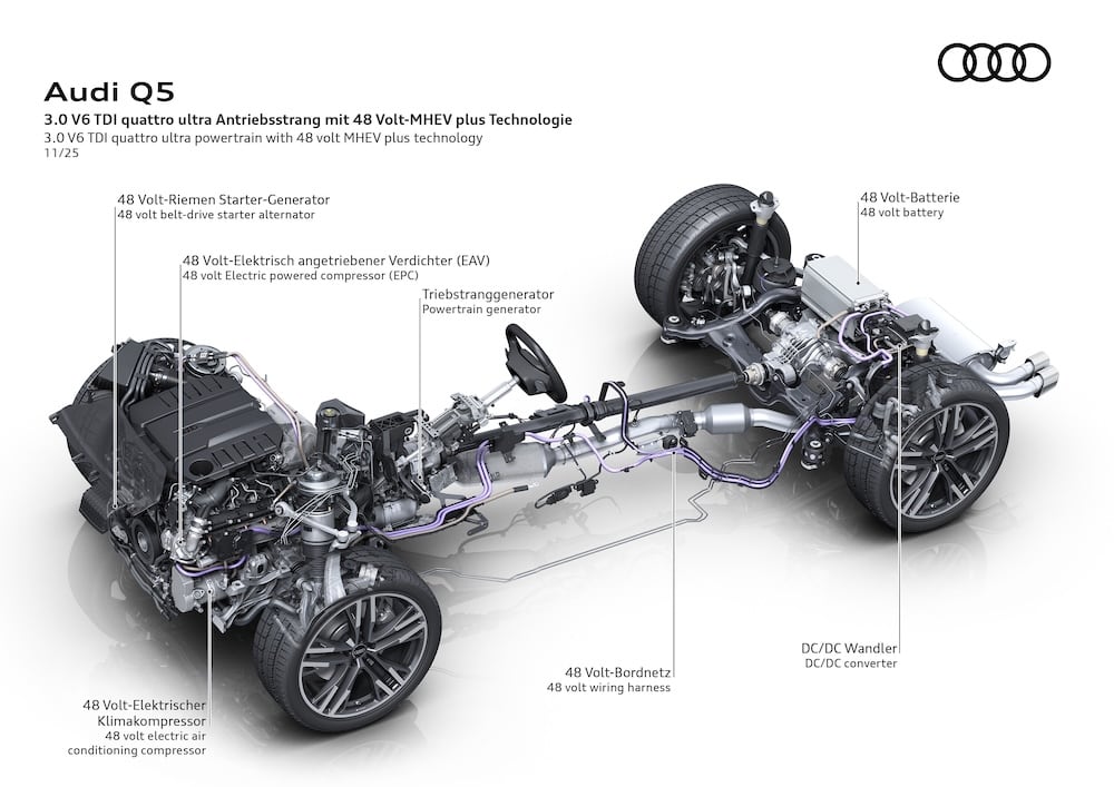 Darstellung des Antriebsstrangs des Audi Q5 3.0 V6 TDI quattro ultra mit Mild-Hybrid-Technologie (MHEV). Sichtbar sind der 48-Volt-Riemen-Starter-Generator, die 48-Volt-Batterie, der elektrisch angetriebene Verdichter (EAV) sowie die Verkabelung des 48-Volt-Bordnetzes.